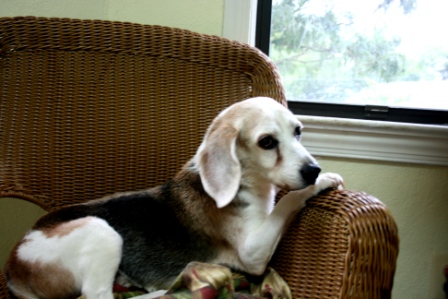 Marcus the Beagle is a handsome, gentle fellow who has likes to recline in his chair when he is at the spa.